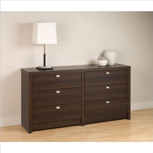 The Prepac Series 9 Designer Collection Espresso 6 Drawer Double Dresser has bold, thick tops and sides that will provide your bedroom with a high level of sophistication and style. This dresser pairs substance and style with chrome finished metal pulls that provide easy access to six drawers' worth of space for your clothing. Take advantage of this dresser's eye-catching thick top and sides by adding decorative candles, photos and more on its top surface. Pair it with other pieces from the Series 9 Designer Collection from Prepac to complete your bedroom makeover. Features: Drawers run smoothly on metal glides with built-in safety stops Clear lacquered real wood drawer sides Drawers feature a stylish rectangular chrome-finished metal pull Finished in durable rich espresso laminate Constructed from CARB-compliant, laminated composite woods with a sturdy MDF backer Ships Ready to Assemble, includes an instruction booklet for easy assembly and has a 5-year manufacturer's limited parts warranty. Proudly manufactured in North America Specifications: Assembled dimensions: 58.5"W x 29.75"H x 15.25"D Drawer Interior: 24.75"W x 5"H x 12.5"D ...Read