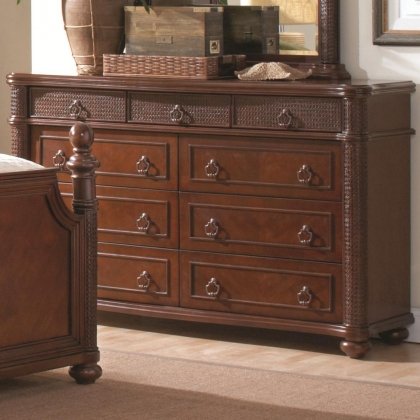 Stylish and winsome the island inspired styling of this Keilani Dresser with 9 Drawers - Coaster Co adds grace and elegance to an already charming piece The rich cherry finish and unique design is accented with wicker resin inlays. READ MORE... |